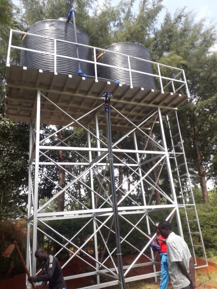 Successful construction of water treatment unit, installation of solarised pump in the underground tanks yield 8 litres per hour pumping to overhead masonry tank of 50000 litres at Givole community water project in Vihiga county Project was funded by Climate change Vihiga county